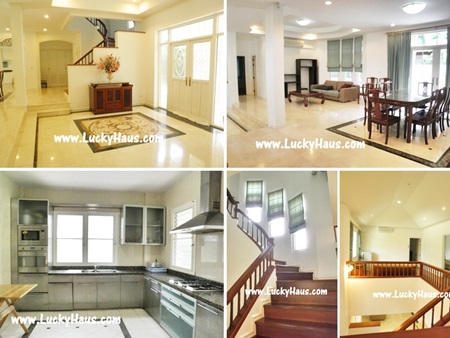 Big single house with pool in exclusive compound on Srinakarin, accessible from Sukhumvit or Bangna quick driving to Suvarnnaphumi airport, private garden with gazebo & pond, 500 Sqm.,2 floors, 4 ensuite bedrooms & family area on 2nd floor, 5th bedroom with attached bathroom & 2 living areas (on 1st floors), shared pool & garden & children play ground.