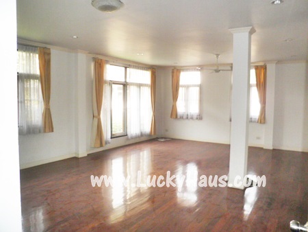 ENORMOUS single house renting on Sukhumvit Ekamai area, about 1 Km. to Ekamai BTS station, propotion of each rooms are big especially living area & hallway on 2nd floor, 550 Sq.m., 2 storeys, 5 bedrooms, private garden, shared pool, security, unfurnished house, for residential only.
